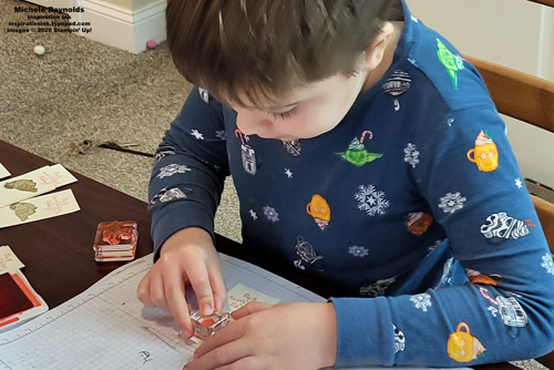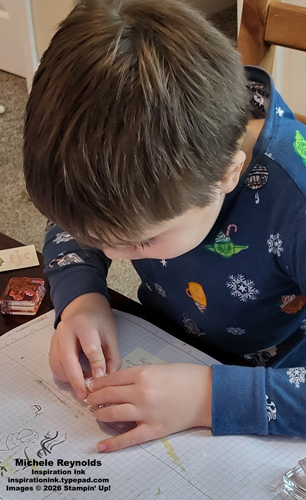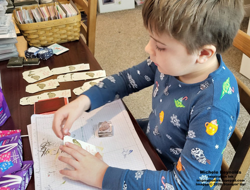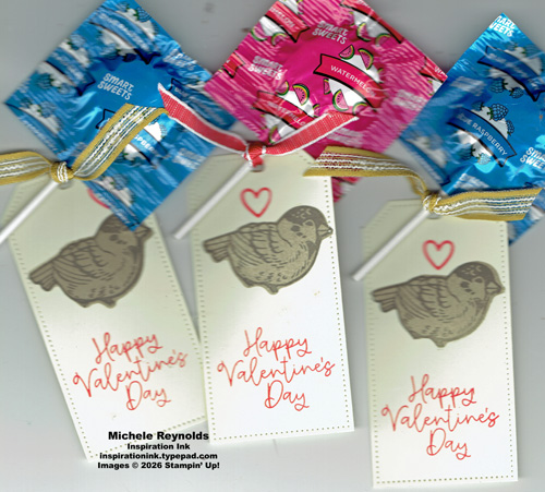 My grandson likes for me to make his class Valentines for him whenever I can. We’ll be out of town around Valentine’s Day, so I got him to help me make his Valentines for this year a bit early while he was visiting us recently. He chose the stamp sets and colors to use. Of course, he chose a bird set, Feathered Fun, because he LOVES birds and paired it with a sentiment from the Bee My Valentine Set. He did all the stamping himself! I just cut out the tags for him and then tied the stamped and addressed tags to the lollipops for him. We did use a retired tag die just to make it easier and I did use retired ribbon to tie the tags on.
