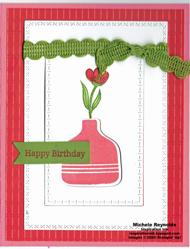 Uses Pop Up Petals Photopolymer Stamp Set and Banner Sayings Photopolymer Stamp Set plus Stampin’ Cut & Emboss Machine, Grid Paper, Paper Trimmer, Stampin’ Pierce Mat, Clear Block B, Clear Block C, Stampin’ Mist Stamp Cleaner and/or Simply Shammy, Stampin’ Seal, Multipurpose Liquid Glue, Tear & Tape Adhesive, Tuxedo Black Memento Pad, Basic White Cardstock, Poppy Parade Classic Stampin’ Pad, Poppy Parade Stampin’ Blends Combo Pack, Flirty Flamingo Cardstock, Flirty Flamingo Classic Stampin’ Pad, Flirty Flamingo Stampin’ Blends Combo Pack, Granny Apple Green Stampin’ Blends Combo Pack, Old Olive Cardstock, Old Olive Stampin’ Blends Combo Pack, Made With Love 12″ x 12″ Designer Series Paper, Old Olive 3/8″ Specialty Rickrack, Three Banner Punch, Pop Up Petals Dies, Textured Notes Dies, Stampin’ Scrub, and scissors.