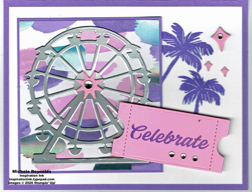 Uses Boardwalk Fun Photopolymer Stamp Set plus Stampin’ Cut & Emboss Machine, Take Your Pick, Paper Trimmer, Stampin’ Pierce Mat, Clear Block B, Clear Block H, Mini Stampin’ Dimensionals, Stampin’ Dimensionals, Stampin’ Seal, Multipurpose Liquid Glue, Silver 12″ x 12″ Foil Sheets, Rhinestone Basic Jewels, Basic White Cardstock, Pretty In Pink Cardstock, Highland Heather Cardstock, Highland Heather Classic Stampin’ Pad, Boardwalk Fun Dies, and Splash Of Sparkles 12″ x 12″ Specialty Designer Series Paper.
