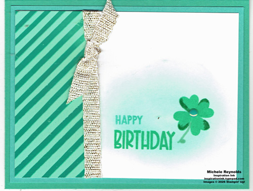 Uses Reason To Celebrate Photopolymer Stamp Set and Endless Love Photopolymer Stamp Set plus Take Your Pick, Grid Paper, Paper Trimmer, Stampin’ Pierce Mat, Clear Block B, Stampin’ Seal, Tear & Tape Adhesive, 2024-2026 In Color Flat Pearls, Small Blending Brushes, Basic White Cardstock, Shy Shamrock Cardstock, Shy Shamrock Classic Stampin’ Pad, Shy Shamrock Stampin’ Blends Combo Pack, Summer Splash Cardstock,Summer Splash Classic Stampin’ Pad, Shaded Spruce Stampin’ Blends Combo Pack, White With Gold 3/8″ Ribbon, Pleasant Patterns 12″ x 12″ Specialty Designer Series Paper, and scissors.
