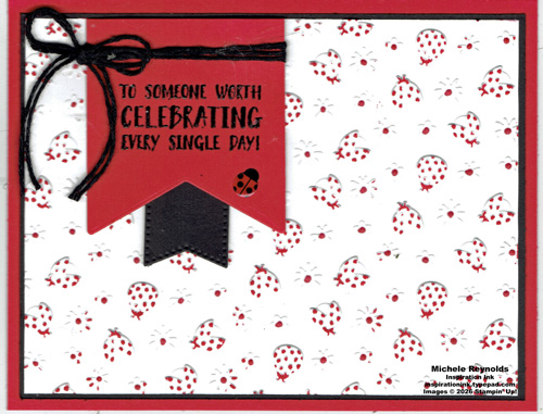 Uses The Right Words Cling Stamp Set plus Stampin’ Cut & Emboss Machine, Heat Tool, Take Your Pick, Grid Paper, Paper Trimmer, Stylish Shapes Dies, Clear Block C, Stampin’ Seal, Mini Glue Dots, Tear & Tape Adhesive, Baker’s Twine Essentials Pack, Stampin’ Brayer, VersaMark Pad, Basics Wow! Embossing Powder, Basic White Cardstock, Basic Black Cardstock, Real Red Cardstock, Real Red Classic Stampin’ Pad, Real Red Stampin’ Blends Combo Pack, Ladybug Garden Epoxy Shapes, Ladybug Picnic 3D Embossing Folder, Creative Haven Dies, Embossing Additions Tool Kit, and scissors.