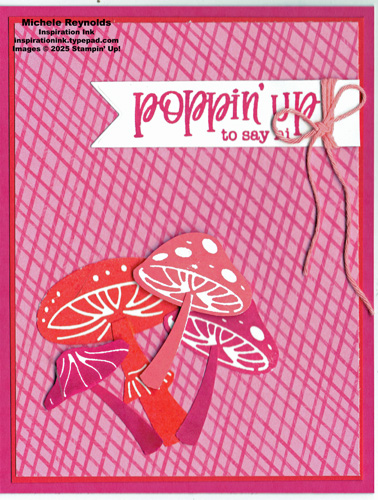 Uses Terrific Toadstools Photopolymer Stamp Set plus Paper Snips Scissors, Multipurpose Liquid Glue, Simply Shammy and/or Stampin' Mist Stamp Cleaner and Stampin' Scrub, Stampin' Pierce Mat, Clear Block B, Clear Block C, Clear Block H, Baker's Twine Three Color Pack, Stampin' Seal, Mini Stampin' Dimensionals, Tear & Tape Adhesive, Paper Trimmer, Poppy Parade Cardstock, Poppy Parade Classic Stampin' Pad, Melon Mambo Cardstock, Melon Mambo Classic Stampin' Pad, Flirty Flamingo Classic Stampin' Pad, Basic White Cardstock, Terrific Toadstools Builder Punch, Toadstool Gardens 6" x 6" Designer Series Paper, and Greetings Of The Season Dies.