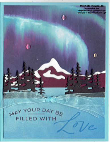 My husband and I recently returned from a fantastic trip to Alaska and the Yukon. We were even lucky enough to see the Northern Lights a couple of nights. So, the gorgeous new Lights Of Aurora Suite Collection, which includes the Light & Wonder Bundle, was a must have purchase for me. I used the products to make this pretty card which I’m sending to our son and son-in-law along with some souvenirs we bought for them.