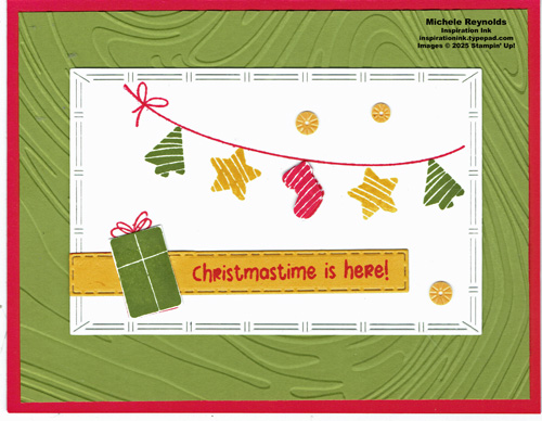 Uses A Little Cheer Photopolymer Stamp Set plus Stampin’ Cut & Emboss Machine, Take Your Pick, Paper Trimmer, Stampin’ Pierce Mat, So Swirly Embossing Folder, Clear Block B, Clear Block H, Stampin’ Mist Stamp Cleaner and/or Simply Shammy, Mini Stampin’ Dimensionals, Stampin’ Seal, Basic White Cardstock, Real Red Cardstock, Real Red Classic Stampin’ Pad, Crushed Curry Cardstock, Crushed Curry Classic Stampin’ Pad, Old Olive Cardstock, Old Olive Classic Stampin’ Pad, A Little Cheer Mini Punch Pack, Textured Notes Dies, Starburst Sequins, Stampin’ Scrub, and scissors.