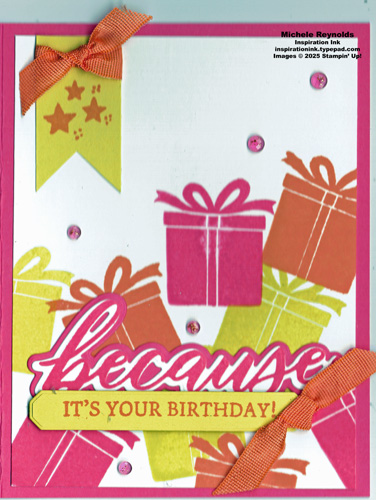 Uses Party Celebrations Photopolymer Stamp Set and Words Of Beauty Photopolymer Stamp Set plus Stampin’ Cut & Emboss Machine or Mini Stampin’ Cut & Emboss Machine, Take Your Pick, Grid Paper, Stampin’ Up! Masking Paper, Paper Trimmer, Stampin’ Pierce Mat, Clear Block B, Clear Block C, Clear Block H, Stampin’ Mist Stamp Cleaner and/or Simply Shammy, Mini Stampin’ Dimensionals, Stampin’ Seal, Multipurpose Liquid Glue, Mini Glue Dots, Timid Tiger 3/8″ Faux Linen Ribbon, Basic White Cardstock, Strawberry Slush Cardstock, Strawberry Slush Classic Stampin’ Pad, Timid Tiger Classic Stampin’ Pad, Darling Duckling Cardstock, Darling Duckling Classic Stampin’ Pad, Words Of Beauty Dies, Strawberry Slush & Pretty In Pink Gems, Stampin’ Scrub, and scissors.