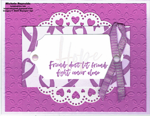 Don’t forget that the Love & Courage Set in the Mini Catalog is this year’s Making A Difference product. For every set purchased, Stampin’ Up!™ will donate $3 to breast cancer organizations. Of course, you can create cards for any kind of cancer by simply using different colors of ink and cardstock.