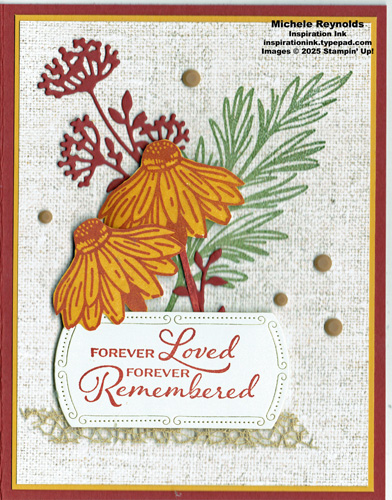 Uses Natural Botanicals Photopolymer Stamp Set and The Right Words Cling Stamp Set plus Beautiful Motifs Dies, Stampin’ Cut & Emboss or Mini Stampin’ Cut & Emboss, Take Your Pick, Paper Trimmer, Stampin’ Pierce Mat, Clear Block D, Clear Block E, Stampin’ Mist Stamp Cleaner and/or Simply Shammy, Stampin’ Dimensionals, Stampin’ Seal, Multipurpose Liquid Glue, Very Vanilla Cardstock, Cajun Craze Cardstock, Cajun Craze Classic Stampin’ Pad, Crushed Curry Cardstock, Crushed Curry Classic Stampin’ Pad, Old Olive Classic Stampin’ Pad, Traditional Labels Dies, Irregular Weave 3/8″ Trim, Woven Textures 12″ x 12″ Designer Series Paper, Neutral Matte Dots, Stampin’ Scrub, and scissors.