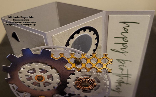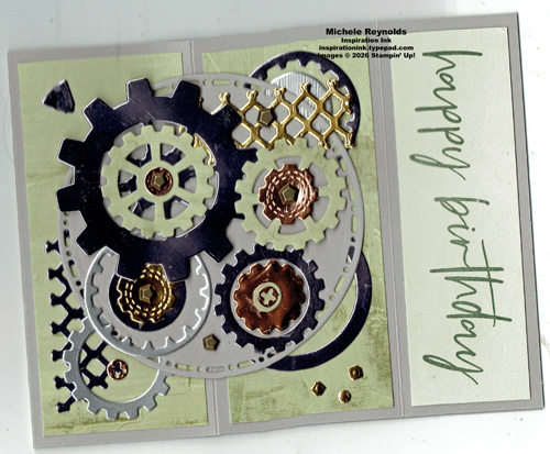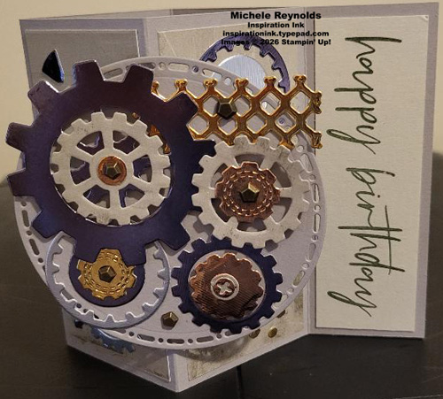 Our son-in-law is an engineer and works for a company that makes equipment and manufacturing processes for auto makers. So, I had to make him a birthday card using the Gears & Textures Dies. I combined that with a sentiment from the January Product Of The Month Fabulous Sayings Set and a fun fold I figured he’d appreciate as an engineer.
