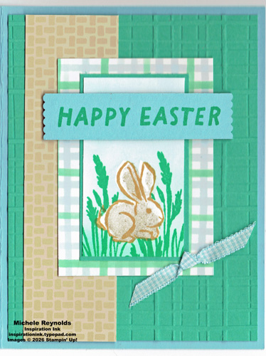 Uses Notes Of Spring Photopolymer Stamp Set and Easter Basket Photopolymer Stamp Set plus Stampin’ Cut & Emboss Machine, Grid Paper, Stampin’ Up! Masking Paper, Paper Trimmer, Stampin’ Pierce Mat, Happy Labels Pick A Punch, Forever Plaid 3D Embossing Folder, Clear Block B, Clear Block C, Clear Block H, Stampin’ Dimensionals, Stampin’ Seal, Mini Glue Dots, Small Blending Brushes, Basic White Cardstock, Shy Shamrock Cardstock, Shy Shamrock Classic Stampin’ Pad, Balmy Blue Cardstock, Balmy Blue Classic Stampin’ Pad, Crumb Cake Classic Stampin’ Pad, Balmy Blue 1/4″ Gingham Ribbon, Easter Joy 12″ x 12″ Specialty Designer Series Paper, Golden Glow Classic Stampin’ Pad, and scissors.
